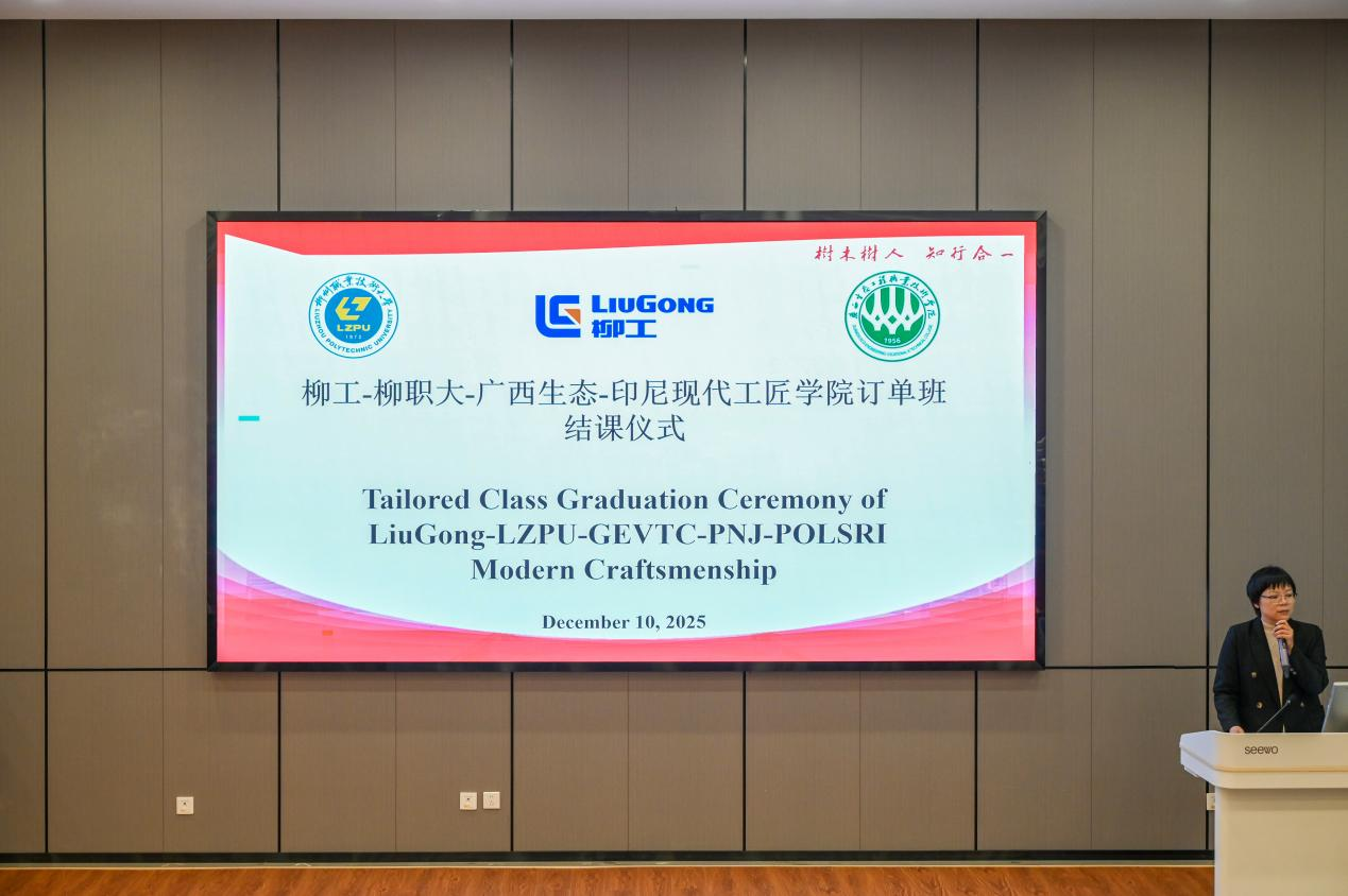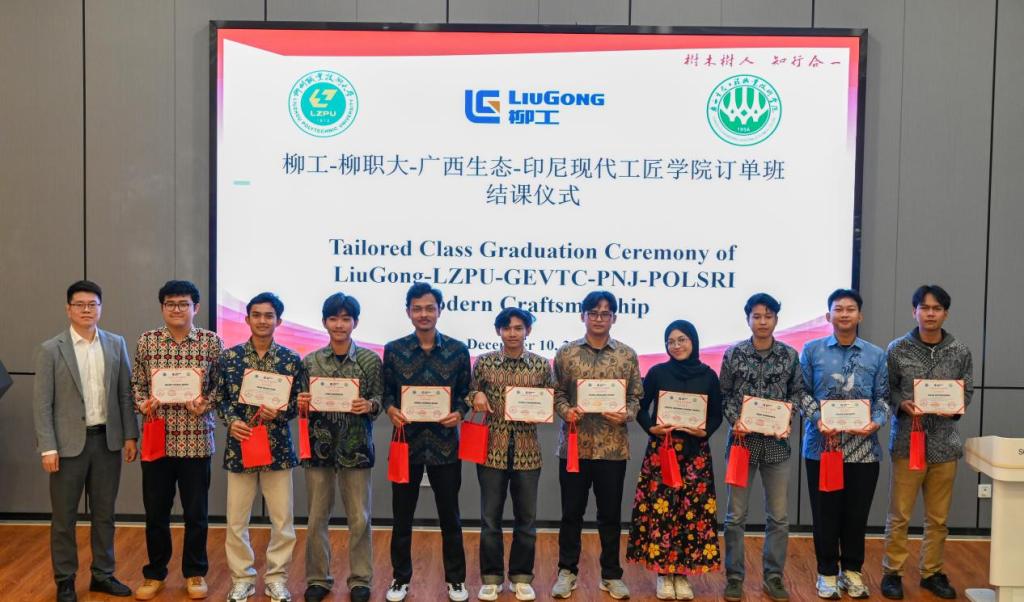 12月10日上午,第三期“柳工-柳职大-广西生态-印尼现代工匠学院订单班”结课仪式在广西生态工程职业技术学院图书馆树人报告厅举行。来自广西柳工机械股份有限公司、柳州职业技术大学、广西生态工程职业技术学院的领导、教师代表与圆满完成阶段性学习的29名印尼订单班学员齐聚一堂,共同回顾学习历程、展示培训成果。